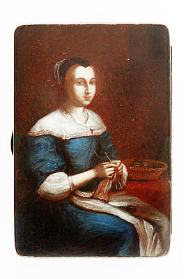 Rechteckige Dose mit junger Niederländerin mit Haube bei der Handarbeit am Tisch.