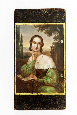 Rechteckige Dose, schwarz mit Goldbläschendekor. In goldgerahmtem Rechteckfeld: Sitzende junge Frau mit Zopffrisur mit geöffnetem Buch in italienischer Landschaft. Links im Bild Zypressen.