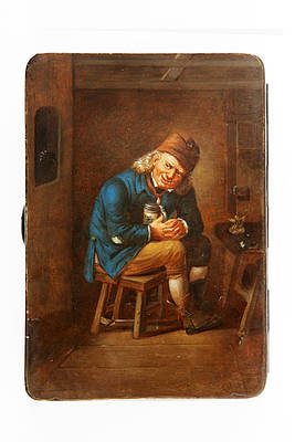 Rechteckige Dose mit Interieurszene. Junger, zufriedener Mann mit einem Bierkrug mit Deckel im Arm auf einem Hocker in der Bauernstube.