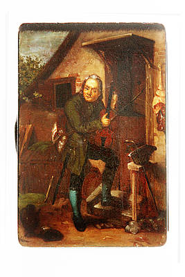 Rechteckige Dose. Ländlich gekleideter Violinspieler mit Umhängetasche beim Stimmen seines Instrumentes vor einem Bauernhaus. Malerei nach einer Vorlage von Eduard Pistorius (1796-1862).