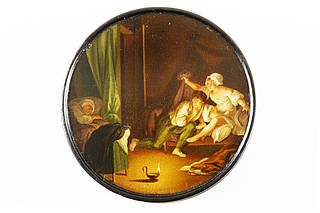 Runde Dose mit leicht erotischer Szene. Junges Paar beim heimlichen Rendezvouz in Großmutters Schlafkammer. Im Vordergrund am Boden brennender Nachtleuchter. Hinter dem Vorhang schlafende Alte.