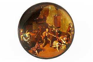 Runde Dose mit zahlreichen, umherirrenden Personen beim Blindekuhspiel in einer Kammer. Malerei nach einer Vorlage von David Wilkie (1785-1841).