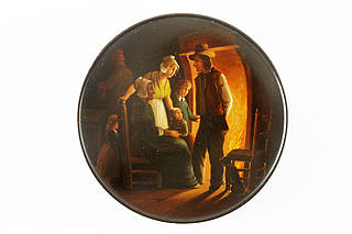 Runde Dose mit trauter Familienszene vor dem brennenden Kamin. Sitzende Großmutter, Vater, Mutter und drei Kinder sowie Hund beim winterlichen Zusammensein am Abend. Im Hintergrund ein weiterer Mann mit Krug am Tisch.