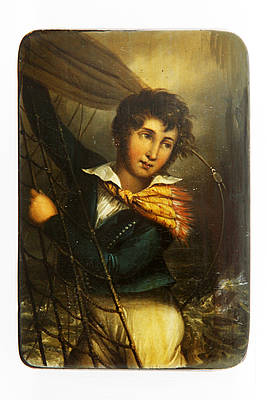 Rechteckige Dose mit Hüftbild eines jungen Seemanns an der Strickleiter eines Segelschiffes in stürmischer See.