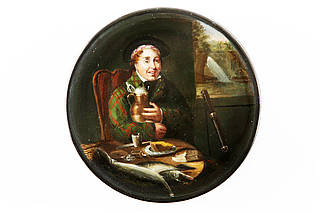 Runde Dose mit jungem, sitzenden Schotten mit kariertem Hausmantel und Barrett. In den Händen ein gefüllter, schäumender Bierkrug. Auf dem gedeckten Tisch Fische und Brot. Am geöffneten Fenster ein Fernrohr mit Stativ. Blick auf einen Fluß mit Wasserfall.