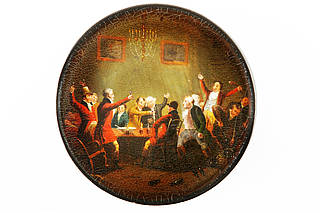 Runde Dose mit einer temperamentvoll feiernden Jagdgesellschaft am Tisch. Malerei nach einer Vorlage von Luke Clennell (1781-1840).