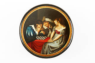 Runde Dose mit einem Paar und einem Zuseher mit Feder am Hut beim Brettspiel. Der junge Spieler in Landsknechtstracht, die junge Frau mit Festkleid und Perlenkette. Darstellung gerahmt in zweifarbigem Goldmedaillon.