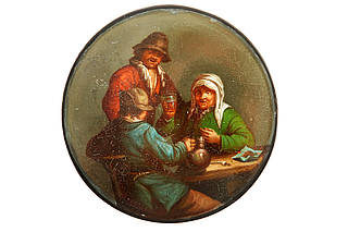 Runde Dose mit drei niederländischen Zechern mit Weinglas und Krug. Auf dem Tisch eine Pfeife und ein Bogen Papier mit Tabak. Neutraler, heller Hintergrund