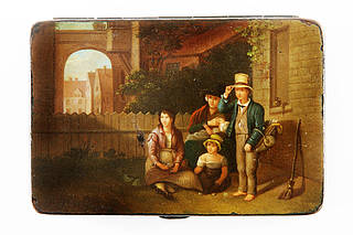 Rechteckige Dose mit fünfköpfiger, verwaister Familie im Hinterhof eines Hauses vor einem Bretterzaun. Im Hintergrund Torbogen mit Blick auf einen Kleinstadtplatz.