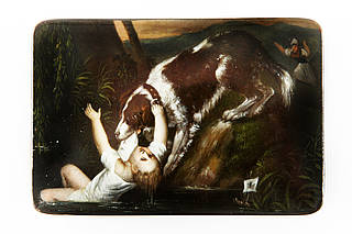 Rechteckige Dose mit einem Neufundländer-Hund, der ein kleines Kind, das mit kleinem Segelboot spielte, aus dem Fluß zieht und so vor dem Ertrinken rettet. Im Hintergrund die herbeieilende Mutter mit erhobenen Armen.
