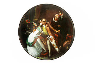Runde Dose mit einer Theaterszene aus einem Schauspiel Casanovas. Älterer, im Sessel niedergesunkener Herr, der von junger und älterer Frau sowie einem Doktor umsorgt wird.