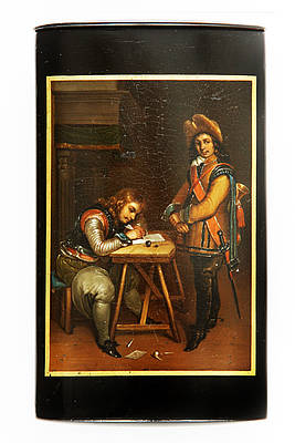 Rechteckiges Zigarrenetui. In schmaler Goldrahmung: Zwei Landsknechte in einer Schreibstube. Einer der beiden beim Schreiben eines Briefes am Tisch; der andere stehend mit Degen und umgehängter Trompete. Am Boden eine Tabakspfeife, ein Schriftstück und weitere Utensilien.