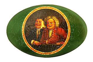 Ovale Dose, grün lackiert. In schmaler, zweifarbiger Goldrahmung: Rundmedaillon mit zwei älteren, lachenden Herren in Barockkleidung. Einer von ihnen mit Taschentuch, der andere mit Allonge-Perücke. Malerei nach dem Stich "The laughing audience" (Die lächerliche Verhandlung) von William Hogarth (1697-1864).