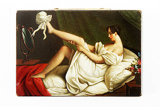 Rechteckige Dose mit junger Frau im Schlafgewand mit ihrer Schlafhaube vor dem Klappspiegel posierend. Neben dem Bett auf dem Nachtkasten ein Blumenstrauß in der Vase. Im Hintergrund geraffter Vorhang.