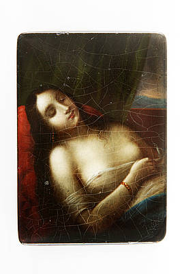 Rechteckige Dose mit träumender, junger Schönheit mit entblösstem Busen in den Kissen. Im Hintergrund geraffter Vorhang, der den Blick in eine Berglandschaft freigibt.