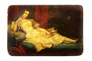 Rechteckige Dose mit junger, auf dem Ruhelager liegender Frau mit auf ein Kissen aufgestütztem Arm in freudiger Erwartung. Im Hintergrund ein Vorhang.