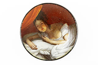 Runde Dose mit junger, vor sich hin träumender Frau im Nachtgewand in den Kissen. Über ihr ein geraffter, nach links gezogener Vorhang.