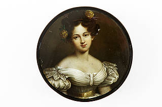 Runde Dose mit Bildnis einer jungen Frau mit tief decolletiertem Kleid mit kurzen Puffärmeln und Blüten im Haar.