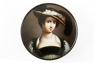 Runde Dose. In schmaler, goldfarbener Rundmedailloneinfassung: Bildnis einer jungen Frau mit großem Hut mit Straußenfedern, Perlenkette und tiefem Dekolleté vor wolkigem Hintergrund. Bei der Dargestellten handelt es sich um Susanna Lunden (1599-1628), der Schwester von Rubens zweiter Frau Helene Fourment. Malerei nach einem Gemälde von Peter Paul Rubens (1577-1640). Das Originalgemälde befindet sich heute in der National Gallery in London.