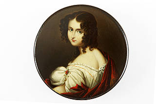Runde Dose mit Bildnis einer jungen, über die entblößte Schulter blickenden Frau mit Lockenfrisur, weißer Bluse mit gebauschtem Ärmel mit Schmuckagraffe sowie Schultertuch mit Fransen. Die Dargestellte, Elisabeth Rosamund Stanley (1709-1794), spätere Lady Stanhope, nach einer Stichvorlage von Theodosius Charles Heath (1785-1848) nach einer Zeichnung von Simon Jaques Rochard (1788-1872) oder seinem Bruder Francois Théodor Rochard (1798-1858).