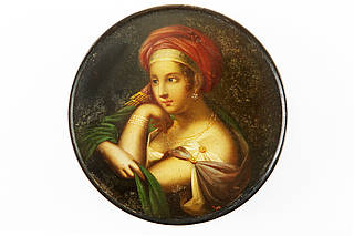 Runde Dose mit Bildnis der Schwester der Gründerin Karthagos, der Königstochter Dido. Malereiausschnitt aus dem Gemälde "Aeneas berichtet Dido vom Untergang Trojas" von Pierre-Narcise Guérin (1774-1833).