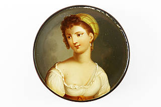 Runde Dose mit Bildnis einer jungen Frau mit neckisch zur Seite gewandtem Blick, Turban, Perlohrring und entblösstem Busen vor Wolkenhintergrund.