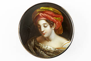 Runde Dose mit Bildnis einer jungen, schamhaft nach unten blickenden Orientalin mit üppig gebundenem Turban mit Fransen und geblümtem Schultertuch. Neutraler Hintergrund.