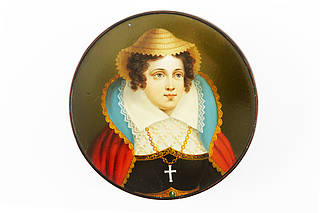 Runde Dose mit Bildnis der schottischen Königin Maria Stuart (reg. 1553-1558) mit Haube, Bluse mit weißem, hochgestellten Spitzenkragen und Perlenbesatz sowie Mantelumhang mit Spitzenbesatz und Goldkette mit Kreuz.