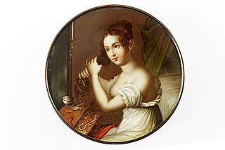 Runde Dose mit junger Frau im Nachtgewand beim Haareflechten vor dem Spiegel im Schlafgemach. Vor dem Spiegel diverse Schönheitsutensilien und Schmuckstücke.