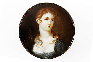 Runde Dose mit dem Bildnis einer jungen Schönen mit langem, rotem Haar und Perlenkette in morgendlicher Aufmachung. Neutraler, verlaufender Hintergrund.