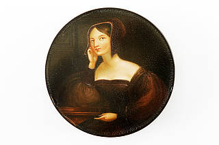 Runde Dose mit dem Bildnis einer jungen Frau mit streng gescheitelter Frisur, Samthaube und dunkelbraunem Kleid mit Samtbordüren sowie stark gebauschten Keulenärmeln. Kleidung im Stil der sog. Tudor-Zeit. Im Vordergrund Tischplatte; im Hintergrund schemenhafte Andeutung eines Fensters.