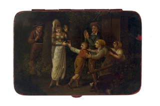 BeschreibungRechteckige Dose mit einer Szene aus Friedrich von Schillers Drama "Die Jungfrau von Orléans", V. Aufzug, II. Auftritt. "Das ist die Hexe von Orléans- Gott sei uns gnädig". Johanna erscheint einer erschrockenen Bauernfamilie vor einer Hütte im Wald. Malerei nach einer Stichvorlage von Carl Ernst Christoph Hess (1755-1828) nach Johann Heinrich Ramberg (1763-1840).