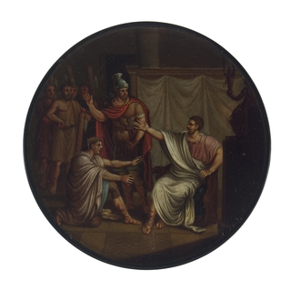 Runde Dose mit einer Szene aus dem alten Rom. Knieender Jüngling vor seinem Herrn und Sodaten mit römischem Helm vor gerafftem Vorhang. Im Hintergrund mehrere Zuseher des Geschehens.