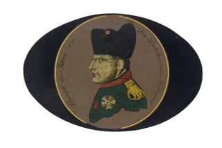 Ovale Dose, schwarz lackiert. In mit schmaler Goldkordel gerahmtem Rundmedaillon: Profilbildnis Napoleons, gebildet aus unbekleideten Leichen, sog. Leichenkopf. Den Zweispitz bildet ein schwarzer Adler, der Orden ist ein Spinnennetz mit darin lauernder Spinne, die Epaulette als gekrallte Hand dargestellt, die nach Europa greift. Übermalung einer Radierung nach einer Karikatur der Gebrüder Henschel von 1813. Um die Darstellung herum bezeichnet: Triumph des Jahres 1813. Den Deutschen zum Neuenjahr. Rückseite der Dose mit einem Plan der Völkerschlacht von Leipzig 1813.