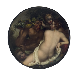Runde Dose mit Rückenansicht der unbekleideten Venus, zwei Amoretten und einem lüsternen Satyr, welcher ihr eine Schale mit Früchten entgegenhält. Malerei nach dem Gemälde "Venus, Satyr und Amoretten" von Annibale Carracci (1560-1609). Anmerkung: Das Originalgemälde befindet sich in den Uffizien in Florenz.