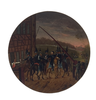 Runder Deckel einer kleinen Schnupftabaksdose mit einer Soldatenszene bei der Rast vor einem Wirtshaus im Fachwerkstil. Im Zentrum Herzog Friedrich Wilhelm, der "Schwarze Herzog" zu Pferde. Daneben Kavalleristen sowie mehrere Privatpersonen. Der Wirt des Gasthauses reicht einem Sodaten des Regiments ein größeres Glas. Im Hintergrund geöffneter Schlagbaum und Landschaft mit Bäumen.