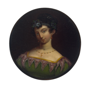Runde Dose mit neckisch blickender, junger Italienerin mit Perlketten und Blumen im Haar sowie Perlencollier mit Kreuzanhänger.
