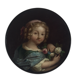 Runde Dose mit kleinem, blondgelockten Mädchen mit stark gebauschten Kleiderärmeln, Perlarmband und Blumenstrauß in Händen. Malerei nach einer Vorlage von Caspar Netscher (1639-1684). Neutraler, dunkler Hintergrund.