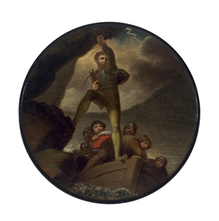 Runde Dose mit heroischer Szene aus Friedrich Schillers Drama Wilhelm Tell. Tell mit seiner Armbrust stößt ein Boot mit einigen Getreuen vom felsigen Ufer in den See. Malerei nach einer Stichvorlage von Heinrich Schmidt (1749-1829) nach Johann Heinrich Ramberg (1763-1840).