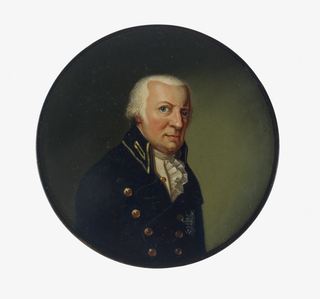 Runde Dose mit Bildnis des Herzogs Carl Wilhelm Ferdinand von Braunschweig (reg. 1780-1806) mit Uniformrock mit Goldknöpfen, Halstuch, Rüschenjabot und Weste. Changierender Hintergrund. Malerei nach einem um 1795 entstandenen Pastell von Johann Heinrich Schröder (1757-1812). Anmerkung: Der Dargestellte regierte als Herzog von 1780-1806 und war Oberfefehlshaber der preußischen Truppen in der Schlacht von Jena und Auerstedt, bei der er im Oktober 1806 verwundet wurde und im darauffolgenden November seinen Verletzungen erlag.
