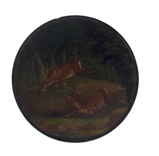 Runde Dose mit zwei Hirschen an einem Fangnetz im Wald. Malerei nach einer Vorlage von Johann Elias Ridinger (1698-1767).