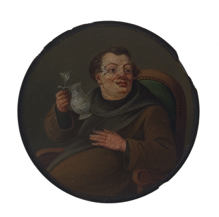 Runde Dose mit einem im Sessel sitzenden Mönch mit Kutte. In der erhobenen rechten Hand einen Deckelkrug haltend. Neutraler, dunkler Hintergrund.