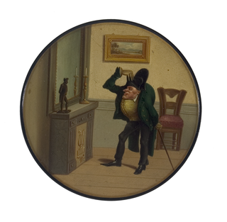 Runde Dose mit einer Persiflage auf den französischen Feldherrn Napoleon. Alter, buckliger Mann (der Zwerg Mayeux) salutiert vor einer auf dem Kaminsims stehenden Kleinplastik Napoleons. Malerei nach einer Vorlage von Joseph Charles Traviès de Villers (1804-1859).