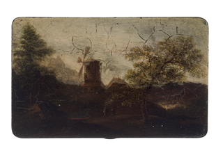 Rechteckige Dose mit dunkler Landschaft mit Windmühle und Bauernkate. Anmerkung: Im Innern Aufkleber: "A. Fehr Gesch. 1915".