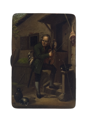 Rechteckige Dose mit einem, seine Geige stimmenden, reisenden Violinspieler vor dem Eingang eines Bauernhauses. Am Boden ein stehender sowie ein umgestürzter Tonkrug. Malerei nach einer Vorlage von Eduard Pistorius (1796-1862).