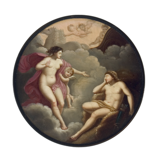 Runde Dose mit der unbekleideten griechischen Göttin der Morgenröte Eos (römisch: Aurora), mit einem Tuch umhüllt von einem Eroten in den Wolken, die sich in den schlafenden, auf einem Fell ruhenden, unbekleideten Kephalos verliebt (den sie entführte und ihm den Sohn Phaeton gebar). Im Himmel ihr von zwei Pferden gezogener Wagen und drei weitere, fliegende Eroten.