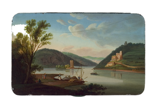 Rechteckige Dose mit einer Rheinlandschaft mit dem "Mäuseturm" bei Bingen. Im Vordergrund Flußufer mit Personenstaffage, Bäumen und Büschen.