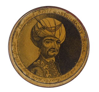 Runde Dose mit einfarbiger Radierung auf gelbem Grund. Bildnis des türkischen Kaisers Abdul Hamit I. in Kriegsuniform mit Turban. Rundum Bezeichnung s. o.