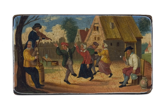 Rechteckige Dose mit musizierenden und tanzenden Bauern im Freien. Im Hintergrund Lattenzaun, Bauernkaten und Kirche. Malerei in der Art des David Teniers (1610-1690).