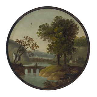 Runde Dose mit einer Phantasielandschaft am Fluß. Im Vordergrund kleinere Steinbrücke mit Wanderer. Rechts große Bäume und kleineres Haus mit daneben liegendem Turm. Im Hintergrund Segelschiffe und Berge. Malerei im Stil des Pascha Johann Friedrich Weitsch (1723-1803).